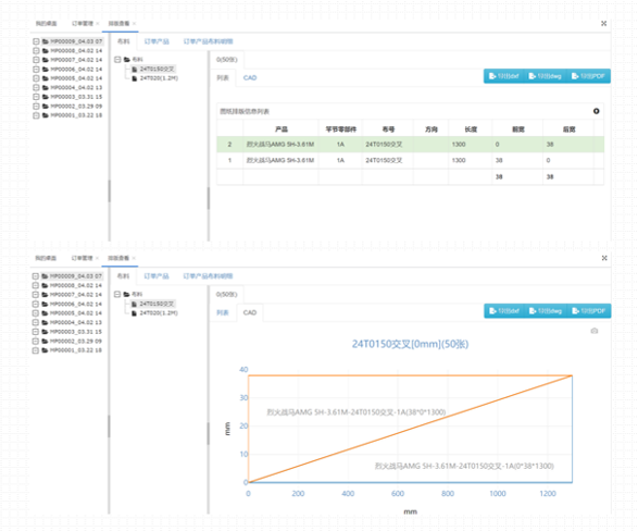 使用AI排产排版算法,,通过选择订单产品,,,根据零部件大小、、剪裁要求以及订单数量自动智能生成排版图纸。。图纸在不借助AutoCAD等第三方软件的前提下,,支持在线排版图纸预览、、导出图片、、、导出CAD格式的dxf和dwg以及导出pdf。。。。